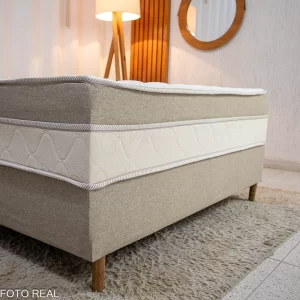 ama Box Casal Sonho Bom Premium: firme e confortável, com espuma D33 certificada pelo INMETRO. Estrutura em madeira, revestimento em linho e acabamento matelassê. Tratamento antiácaro e antifungo. Suporta até 125kg por pessoa, unindo qualidade, durabilidade e sofisticação!
