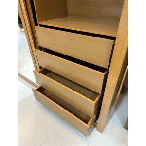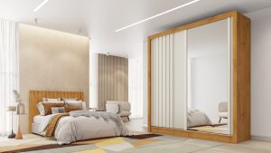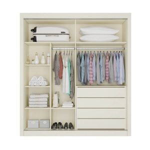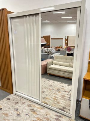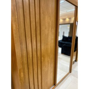 Medidas: Alt 2,18m Larg 1,80m Prof 0,56m Peso 158Kg – 6 Volumes – Estrutura 100% MDF 15mm, 2 Postas Deslizantes com Roldanas de Aço sobre Trilho de Alumínio, sendo uma Porta Ripada e outra Porta com Espelho de 2,04m x 0,74m x0,03m, 4 Gavetas com Corrediças Telescópicas, 2 Nichos com Cabideiros de Alumínio, 6 Nichos para Roupas Pessoais, Roupas de Cama, Malas e Demais Utensílios Pessoais, 1 Nicho Sapateira, Puxadores de Alumínio, Sapatas Plásticas e Acabamento em Pintura UV Semi-Brilho.