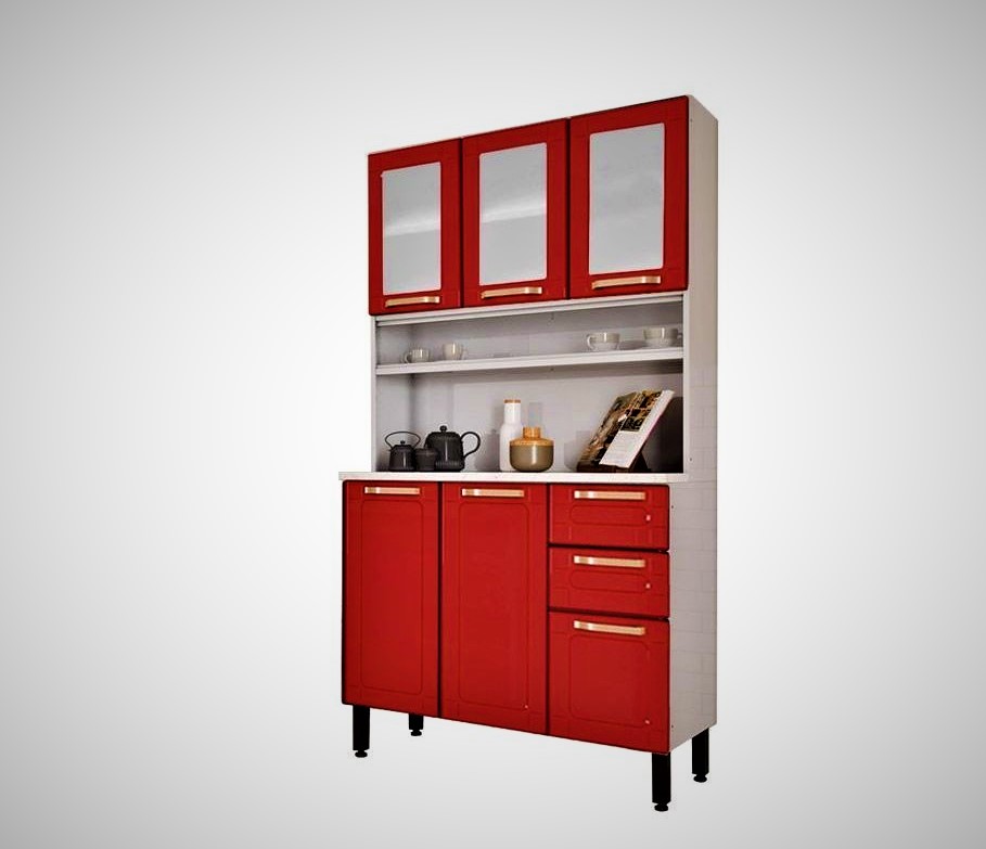 Kit Cozinha Triplo 6 Portas 3 Vidros 2 Gavetas Colors, Côr Vermelho, da Bertolini, Medidas: Alt 1,917m Larg 1,050m Prof 0,432m, Em Aço Carbono com Pintura Epoxi, 6 Portas sendo 3 Superiores com Vidro Serigrafado 3 Inferiores, todas com Dobradiças Regulaveis de Aço, 2 Gavetas com Corrediças Telescópicas, Puxadores Plasticos Dourados, 2 Prateleiras Internas e 1 Externa e Pés Plásticos.