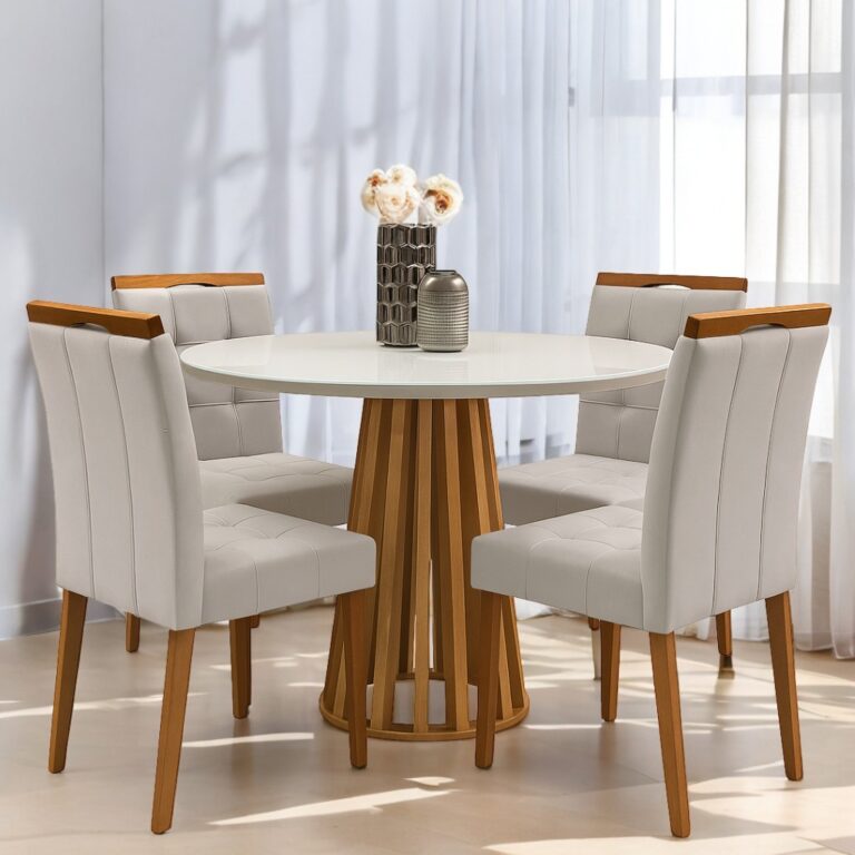 Mesa de Jantar Atlanta Redonda 120cm Vidro Off/Base Madeira + 4 Cad. Santorini Linho